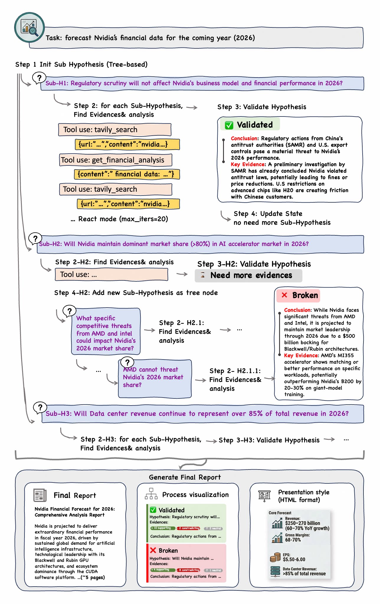 - Tree Exploration: The agent systematically explores these branches to ensure no critical factor is overlooked before aggregating the results into a final conclusion.